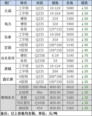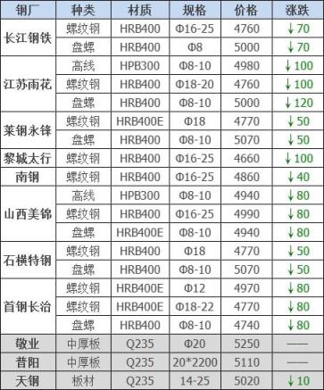 25日12:00起江陰西城刨花類下調50-60,其他不變,調后:精爐料4000重廢3890中廢3830普通爐料3770鋼筋頭4000沖子3890-3940冷熱軋料3790-3890爐料壓塊3600鐵皮壓塊3300鋼刨花3600數(shù)控刨花3510普通刨花3420刨花壓塊3360刨花長絲3310含稅單位:元/噸。