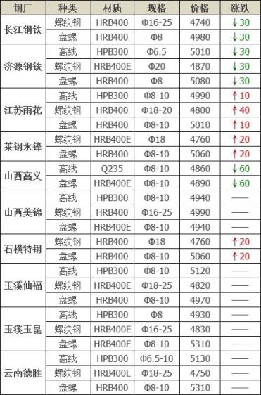 下調(diào)7家,占比46.7%,調(diào)價幅度10-40元/噸;